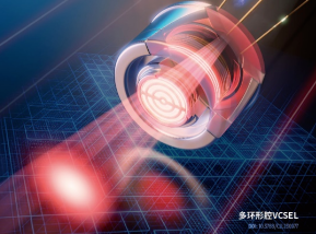 垂直腔面发射激光器VCSEL,激光器VCSEL,激光器, 封面展示了具有多环形腔结构的大孔径垂直腔面发射激光器(VCSEL)。通过将注入电流的区域分割成多个区域,可实现载流子分布的均匀化,进而有效抑制空间烧孔效应。该器件的近场分布均匀且明亮...