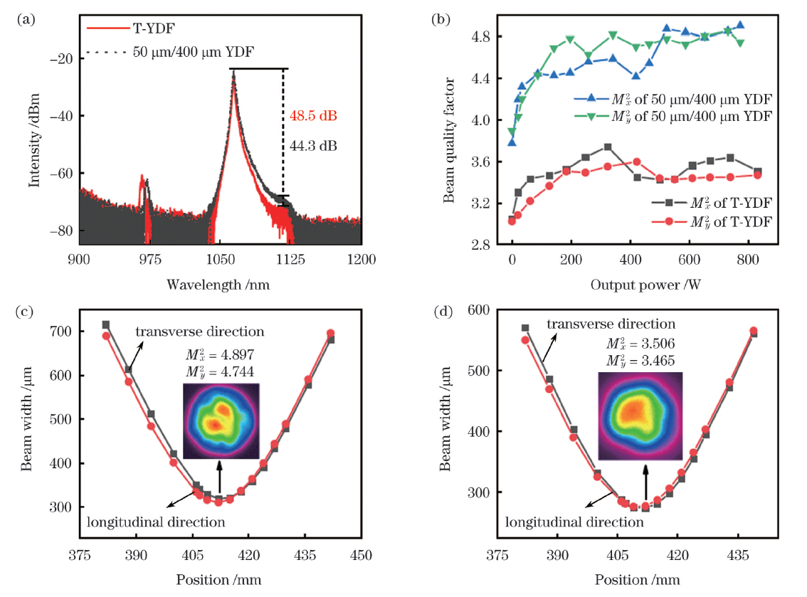 掺镱光纤,纳秒激光器,激光器,大芯径单锥形掺镱光纤(T-YDF)在工业加工中放大高功率纳秒脉冲激光的示意图,背景强调了T-YDF在提高高功率纳秒脉冲激光放大器输出光束质量方面的优化作用。T-YDF通过其纵向变化的芯包层结构,有效抑制了高功率...