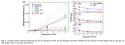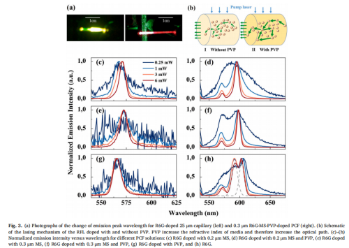 综上所述,我们展示了掺杂R6G染料与聚苯乙烯微球的光子晶体光纤产生的随机激光现象。聚乙烯吡咯烷酮(PVP)能显著增强发射特性,包括发射强度、谱线窄化及偏振度。应用瞬态随机激光理论揭示了该系统发射光谱可能的演化过程。