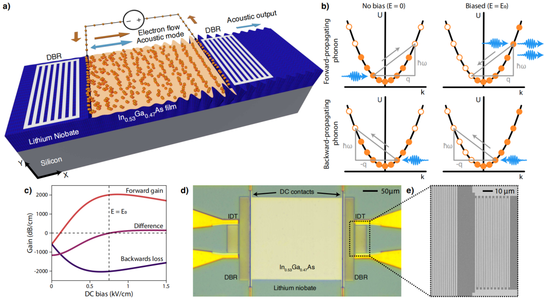 这一构想的核心在于声电效应:在某些材料中,声波与电子可以发生能量交换。研究团队通过异质集成技术,将一层仅50 nm厚的高迁移率铟镓砷(InGaAs)半导体薄膜与一层高性能压电材料铌酸锂(LN)结合。LN作为压电材料,振动时会产生振荡电场;相应地,当器件中存在振荡电场时,会产生振动,器件的InGaAs层的电子在受到电场冲击时被加速。这就可以创造一种非平衡状态:对于向前传播的声波,处于高能态的电子更多,从而能够通过受激发射将能量馈送给声波,使其增强;而对于反向传播的声波,电子则更多地表现为吸收其能量。论文第一作者Alexander Wendt表示,“它倒退时几乎会损失99%的功率,为了实现净增益,我们设计它在前进时获得相当大的增益以克服这个差距。”
