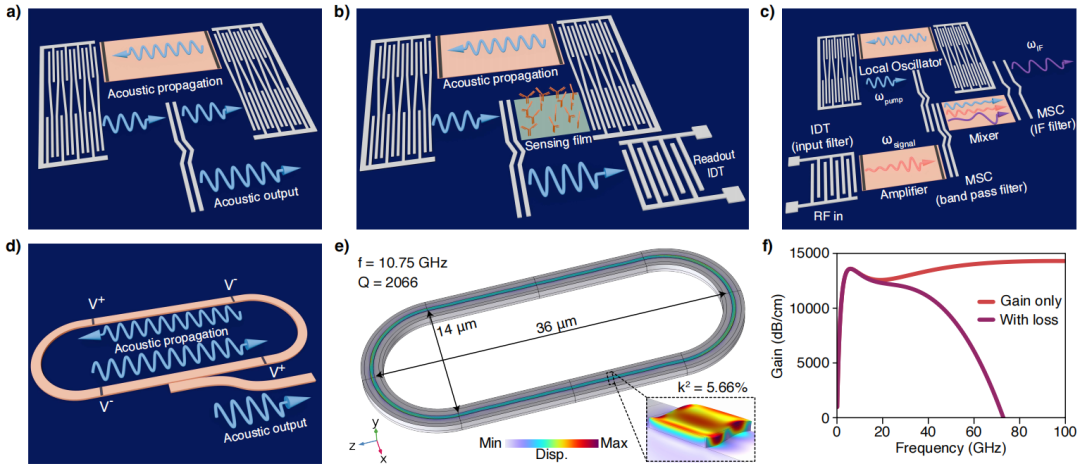 图3 声子激光器的未来应用。(a)环形腔设计;(b)基于SAW-PL的传感器;(c)紧凑型射频信号处理器;(d)SAW-PLs可通过基于波导的谐振器生成高频SAWs来制备。(e, f)高频波导设计及性能扩展预测