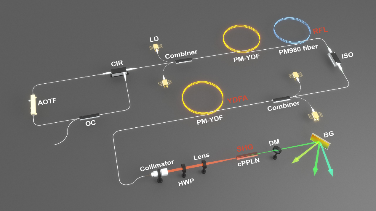 近期,国防科技大学周朴研究员团队基于随机激光非线性频率变换和波长-角度映射机制,成功实现了非机械式的绿光光束偏转。该方案通过构建波长可电控扫描的随机光纤激光器,并结合色散元件,将波长变化线性转化为光束偏转,从而实现了无需机械运动部件的高稳定性光束控制。研究团队设计并搭建了如图1所示的激光系统,该系统主要由以下三个部分构成: