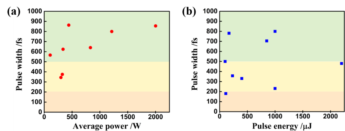 图4汇总了空间结构与全光纤结构两类高功率、高能量光纤CPA系统的典型输出脉宽结果,光纤CPA系统难以稳定产生200 fs以下的脉冲,该现象主要源于放大过程中存在的增益窄化效应、非线性相移累积以及高阶色散失配等因素。2023年,美国IMRA公司通过光谱预整形和高阶色散调控,实现了脉宽为92 fs、单脉冲能量为10 μJ的光纤CPA系统。德国耶拿大学在超快光纤激光相干合成系统中也广泛采用脉冲整形技术,并实现了平均功率1 kW、单脉冲能量10 mJ和脉冲宽度120 fs的超快激光输出。除此之外,采用相干光谱合成及非线性压缩等技术手段,也能实现窄脉宽飞秒激光输出。未来,通过综合运用以上技术手段,有望实现系统性能的协同提升。