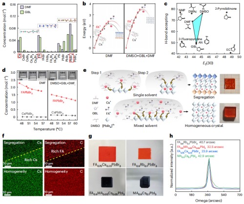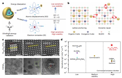 该探测器的优异性能源于A位无机/有机合金化带来的协同效应。当超高能辐射与材料作用时,能量耗散分为非电离能量损失(导致原子位移)和电离能量损失(产生电荷载流子)。钙钛矿中高原子序数元素(Pb 82、Cs 55)的存在显著降低了非电离能量损失,其非电离能量损失值较硅等传统材料低1-2个数量级,最小化了辐射损伤。原位透射电镜研究表明,在纯FAPbBr?中,有机FA?阳离子易挥发并导致晶格不可逆坍塌;而在Cs?掺杂体系中,即使FA?被辐照位移,Cs?作为结构锚点维持了钙钛矿骨架,为自修复创造了时间窗口。在此期间,电离能量损失过程通过强电子-声子耦合在晶格中沉积局域热能,驱动位移的FA?通过热辅助运动扩散回原始位点,实现动态修复。同时,有机阳离子的存在确保了立方晶格结构的保持,对维持高电荷收集效率至关重要。研究还通过溶剂极性工程调控混合溶剂体系(DMSO:DMF:GBL=1:10:10),使Cs?和FA?的脱附能垒趋于一致(3.43 eV vs 3.48 eV),实现了A位阳离子的均匀分布和高结晶质量。