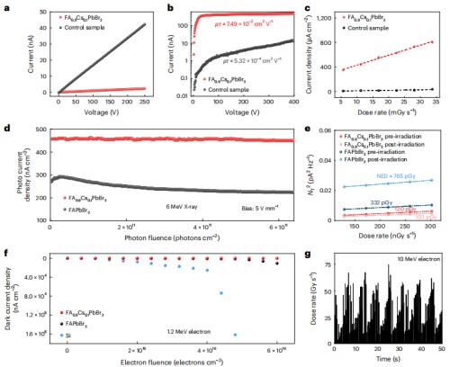 图3. FA0.9Cs0.1PbBr3对6MeV X射线和10MeV电子的探测性能