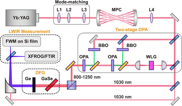 目前长波红外激光面临高重频与高峰值强度难以兼顾的瓶颈,且因缺乏高灵敏度探测器,其空间与时域信息精确测量存在技术难点。对此,超强激光科学与技术全国重点实验室宋立伟和田野研究员团队成功实现了高重频、高峰值功率、可调谐长波红外激光脉冲输出。该光源在实现50 kHz高重复频率的同时,于10 μm处获得121 fs的脉冲宽度和14.8 MV/cm的峰值场强及覆盖-12.5 μm调谐范围、平均功率约12 mW的长波红外激光输出。在脉冲表征方面,团队提出一种基于硅薄膜四波混频的非线性光学成像方法,利用硅基探测器实现了以往难以直接测量的高精度诊断。结合二维光谱成像与互相关频率分辨光学开关(XFROG)技术,团队成功实现了对121 fs脉冲宽度、对应频谱宽度及相位分布的精确重构,测量精度达到少周期量级。相关成果发表在Laser & Photonics Reviews 。