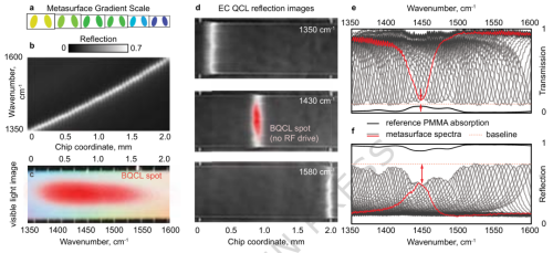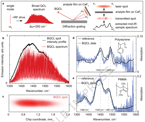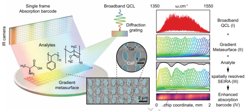 红外成像光谱仪,红外光谱仪,光谱仪,洛桑联邦理工学院 Hatice Altug 团队开发了一种基于快速成像的中红外光谱平台,该平台结合了宽带共振梯度超表面和射频调制量子级联激光器,可产生宽带(250 cm?¹)的瞬时光谱。作者将梯度超表面的共振光谱与激光发射光谱相匹配,从而实现对局部电磁场所有光谱分量的定向放大。