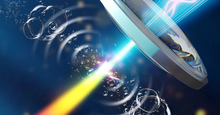 封面展示了近红外飞秒激光的作用场景:激光经透镜聚焦于掺有纳米金颗粒的液体后,在聚焦区域附近通过克尔自聚焦与等离子体的共同作用形成光丝,并辐射出宽带超连续谱。局部金色高亮区域代表纳米金颗粒表面等离子体对局域场的增强效应,密集的气泡象征光丝诱导...