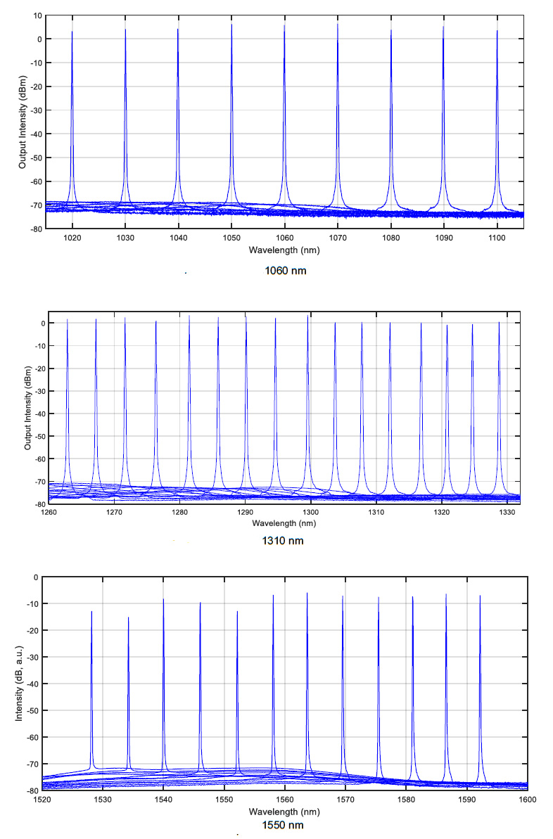 Wavelength (nm) | Tuning range (nm) | Power (mW) | R: Random L: Linear | E: electrical M: manual |