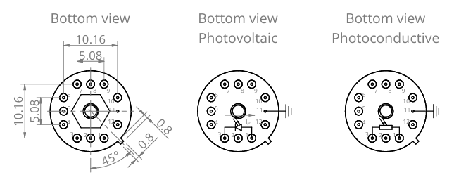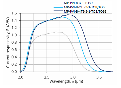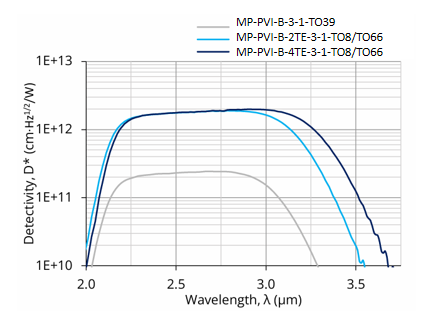 MP-PVI-B-2TE-3-1-TO8 与 MP-PVI-B-2TE-3-1-TO66 是基于HgCdTe异质结的两级热电制冷(2TE)光伏型红外探测器,旨在实现最佳性能与稳定性,并采用光学浸入技术以提升各项参数。其特定波长(λspec)为3.0 µm,光学接收面(Ao)尺寸为1 mm × 1 mm。可根据需求优化起始波长(λcut-on)。施加反向偏压(Vb)可显著提升响应速度与动态范围,虽然这有助于增强高频性能,但需注意偏压探测器产生的1/f噪声可能导致低频性能下降。该探测器提供带3°楔形蓝宝石窗口(wAl2O3)的TO8和TO66封装,以防止不必要的干涉效应。