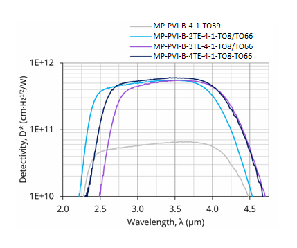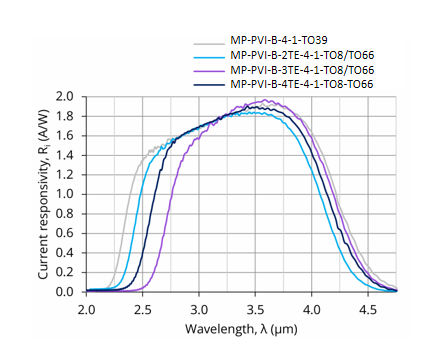 MP-PVI-B-2TE-4-1-TO8 与 MP-PVI-B-2TE-4-1-TO66 是基于 HgCdTe 异质结的两级热电制冷(2TE)光伏型红外探测器,旨在实现最佳性能与稳定性,并采用光学浸入技术以提升各项参数。其特定波长(λspec)为 4.0 µm,光学接收面(Ao)尺寸为 1 mm × 1 mm。可根据需求优化起始波长(λcut-on)。施加反向偏压(Vb)可显著提升响应速度与动态范围,虽然这有助于增强高频性能,但需注意偏压探测器产生的 1/f 噪声可能导致低频性能下降。该探测器提供带 3° 楔形蓝宝石窗口(wAl2O3)的 TO8 和 TO66 封装,以防止不必要的干涉效应。
