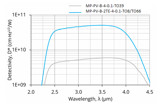 产品特点光谱范围: 2.3 to 5.6 µm;背照式;双级热电冷却;无需偏置;无1/f噪声