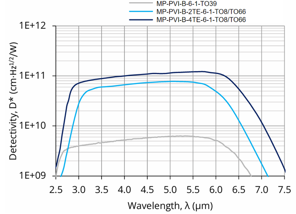 MP-PVI-B-2TE-6-1-TO8和MP-PVI-B-2TE-6-1-TO66是基于 HgCdTe 异质结的两级热电制冷(2TE)光伏型红外探测器,旨在实现最佳性能与稳定性,并采用光学浸入技术以提升各项参数。其特定波长(λspec)为 6.0 µm,光学接收面(Ao)尺寸为 1 mm × 1 mm。可根据需求优化起始波长(λcut-on)。施加反向偏压(Vb)可显著提升响应速度与动态范围,虽然这有助于增强高频性能,但需注意偏压探测器产生的 1/f 噪声可能导致低频性能下降。该探测器提供带 3° 楔形镀增透膜硒化锌窗口(wZnSeAR)的 TO8 和 TO66 封装,以防止不必要的干涉效应。