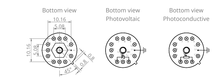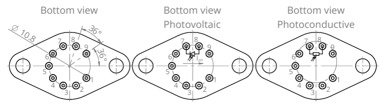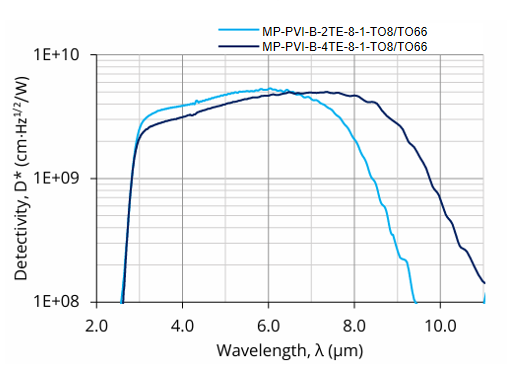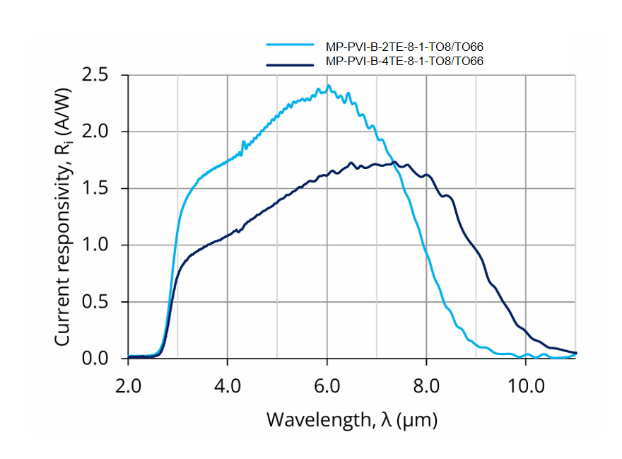 MP-PV-B-4TE-8-1-TO8 与 MP-PV-B-4TE-8-1-TO66 是基于 HgCdTe 异质结构的四级热电制冷(4TE)光伏型红外探测器,旨在实现最佳性能与稳定性,并采用光学浸入技术以提升各项参数。其特定波长(λspec)为 8.0 µm,光学接收面(Ao)尺寸为 1 mm × 1 mm。可根据需求优化起始波长 (λcut-on)。施加反向偏压(Vb)可显著提升响应速度与动态范围,虽然这有助于增强高频性能,但需注意偏压探测器产生的 1/f 噪声可能导致低频性能下降。该探测器提供带 3° 楔形镀增透膜硒化锌窗口(wZnSeAR)的 TO8 和 TO66 封装,以防止不必要的干涉效应。