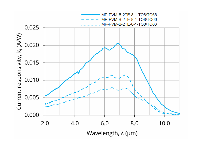MP-PVM-B-2TE-8-2-TO8 与 MP-PVM-B-2TE-8-2-TO66 是基于碲镉汞异质结构的两级热电制冷(2TE)光伏型多结红外探测器,旨在实现最优性能与稳定性。其特定波长(λspec)为8.0 µm,有效感光面积(A)为2 mm × 2 mm。该探测器提供TO8与TO66两种封装形式,并配有3度楔形硒化锌增透膜窗口(wZnSeAR),以消除干涉效应。