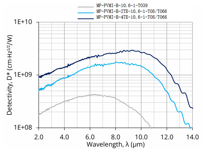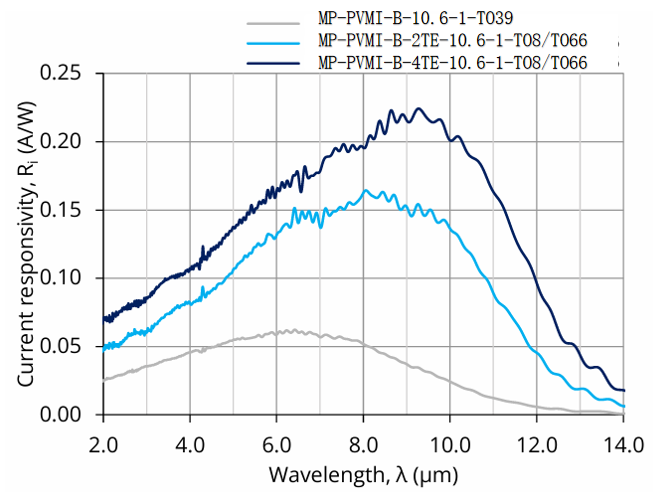 MP-PVMI-B-2TE-10.6-1-TO8和MP-PVMI-B-2TE-10.6-1-TO66是基于 HgCdTe 异质结构的两级热电制冷(2TE)光伏型多结红外探测器,旨在实现最佳性能与稳定性,并采用光学浸入技术以提升各项参数。其特定波长(λspec)为 10.6 µm,光学接收面(Ao)尺寸为 1 mm × 1 mm。该探测器提供带 3° 楔形镀增透膜硒化锌窗口(wZnSeAR)的 TO8 和 TO66 封装,以防止不必要的干涉效应。