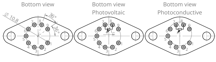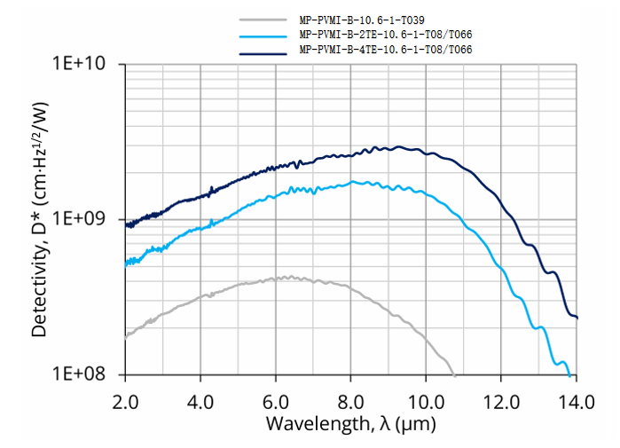MP-PVMI-B-4TE-10.6-1-TO8和MP-PVMI-B-4TE-10.6-1-TO66,均为基于碲镉汞异质结的四级热电制冷(4TE)光伏型多结红外探测器,其设计目标是实现优异的性能与稳定性;同时采用光浸没技术,用以提升各项性能参数。两款探测器的特征波长(λspec)为 10.6 um,光学面积(Ao)为 1 mm x 1 mm。产品分别提供 TO8 和 TO66 两种封装形式,窗口配置为3度 楔形硒化锌增透膜窗口(wZnSeAR),可有效抑制非预期干涉效应。