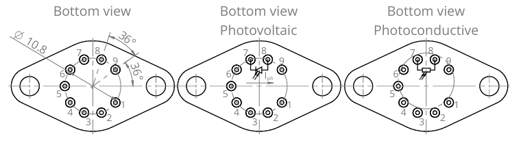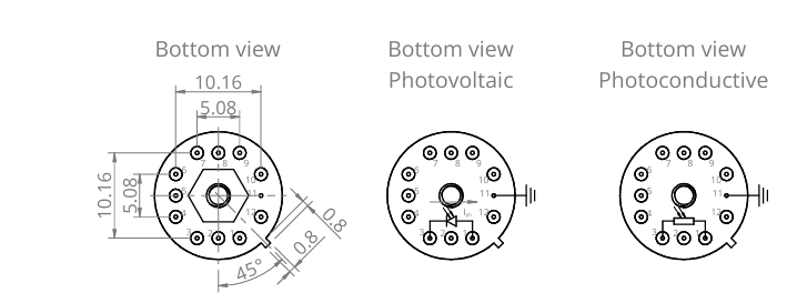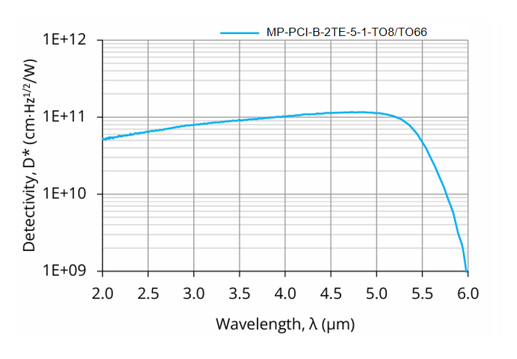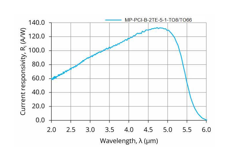 MP-PCI-B-2TE-5-1.0-TO8 与MP-PCI-B-2TE-5-1.0-TO66 是基于碲镉汞异质结的两级热电制冷(2TE)光导型红外探测器,旨在实现最优性能与稳定性,并采用光浸入技术以提升参数性能。其特定波长(λspec)为5.0 µm,有效感光面积(A)为1 mm × 1 mm。探测器应在最佳偏置电压(Vb)和电流读出模式下工作。由于存在1/f噪声,其低频性能会有所降低。该探测器提供TO8与TO66两种封装形式,并配有3度楔形蓝宝石窗口(wAl2O3),以消除干涉效应。