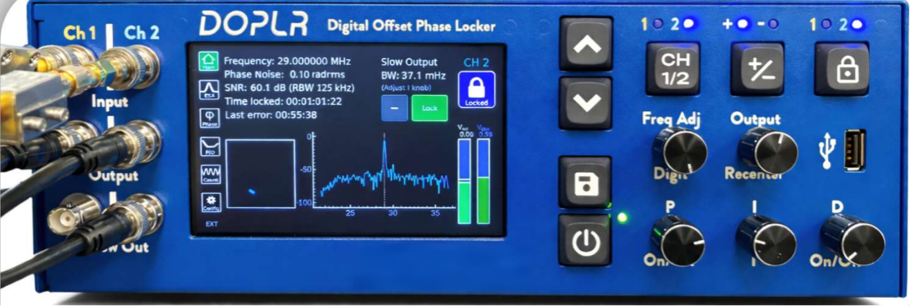 数字偏移相位锁定器(DOPLR)是一款操作简便的台式仪器,用于稳定可调电压的射频(RF)信号。DOPLR 专门为锁定激光外差拍频信号而设计,但也可用于其他电子信号,例如来自电压控制振荡器(VCO)的信号。一个典型应用是利用筱晓光子的 Comb Offset Stabilization Module (COSMO) 与用户的锁模激光器配合,对频率梳的载波包络偏移频率进行稳定。DOPLR 采用 现场可编程门阵列(FPGA) 模块,实现多通道数字相位锁定功能,并集成在一台便捷易用的仪器中。无需安装任何软件。操作非常简单,只需开机并优化环路滤波器设置即可。前面板上的物理旋钮和按键旨在让用户轻松调节最常用的参数。仪器提供多种显示模式,可用作电子频谱分析仪、相位噪声分析仪、环路滤波器可视化工具,以及具有实时 Allan 偏差计算的频率计。