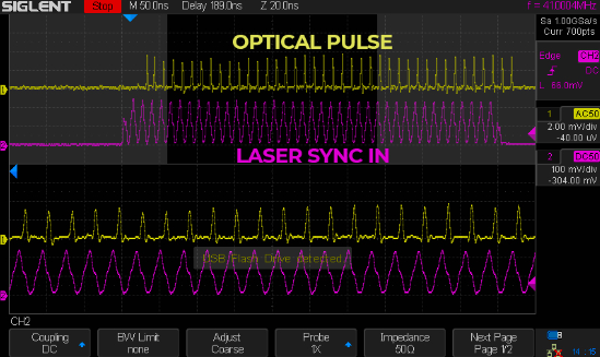 外部激光触发同样可行,需使用专用旋钮功能配合 SMA 连接端口的同步输入接口。外部同步输入信号必须为 50Ω 负载下的 LVTTL 电平,最低可低至 1 kHz。