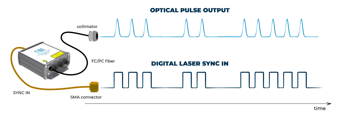 当工作在外部同步模式下,通过激光模块 SMA 连接器的 SYNC IN 端口输入 2.5V、50Ω 数字方波外部触发信号,可按需产生皮秒持续时间的激光脉冲。这种配置能够生成极其精确且受控的时间激光输出,满足各种应用需求,例如时间分辨光谱、显微镜以及需要高精度快速激光时序和同步的科学或工业活动。