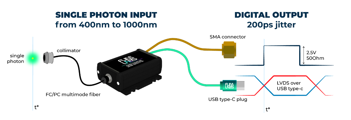 我们的光纤耦合 USB 供电 SPAD 探测器可实现 <150 ps 的时间抖动,以及 20 cps 的暗计数率。在入射光子计数率高达 2.5 Mcounts/s 时,仍能保持吞吐量的线性度。