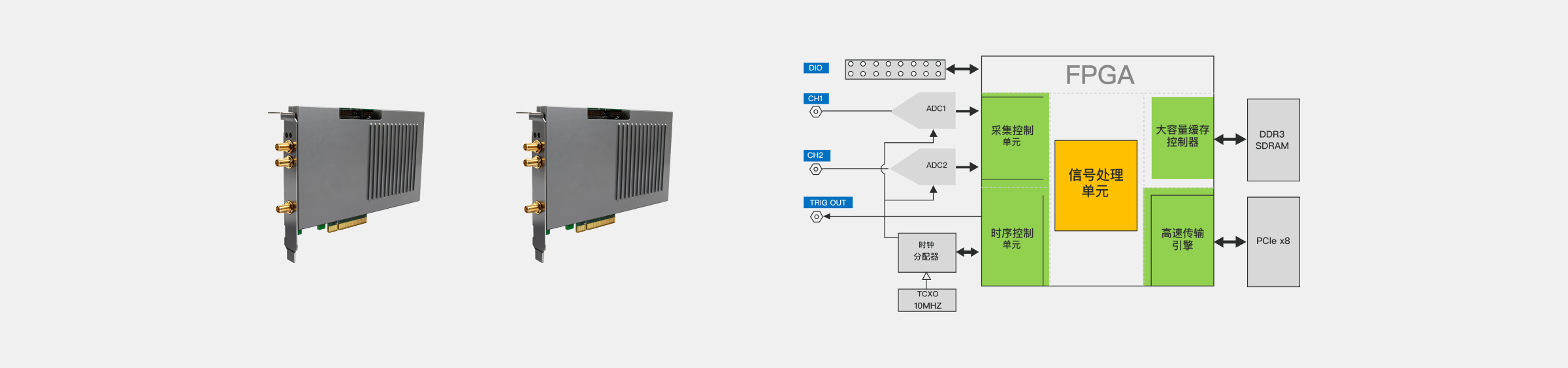 这是一款 PCIe x8 Lane、双通道、14bits 分别率的光纤传感解调卡,采样率 100MSps。板载 XC7K160T/325T 高性能 FPGA 芯片,具有丰富的乘法器和 RAM 资源,具有指数放大、平均、滤波、功率 统计等光纤传感解调算法。通过采用大容量数据缓存和高速数据传输引擎技术,支持原始数据的实时上传, 数据传输速率可达 1.2GB/s。驱动程序具有良好的兼容性,支持 WIN7、WIN8、WIN10 的 32/64bits 多个版本。